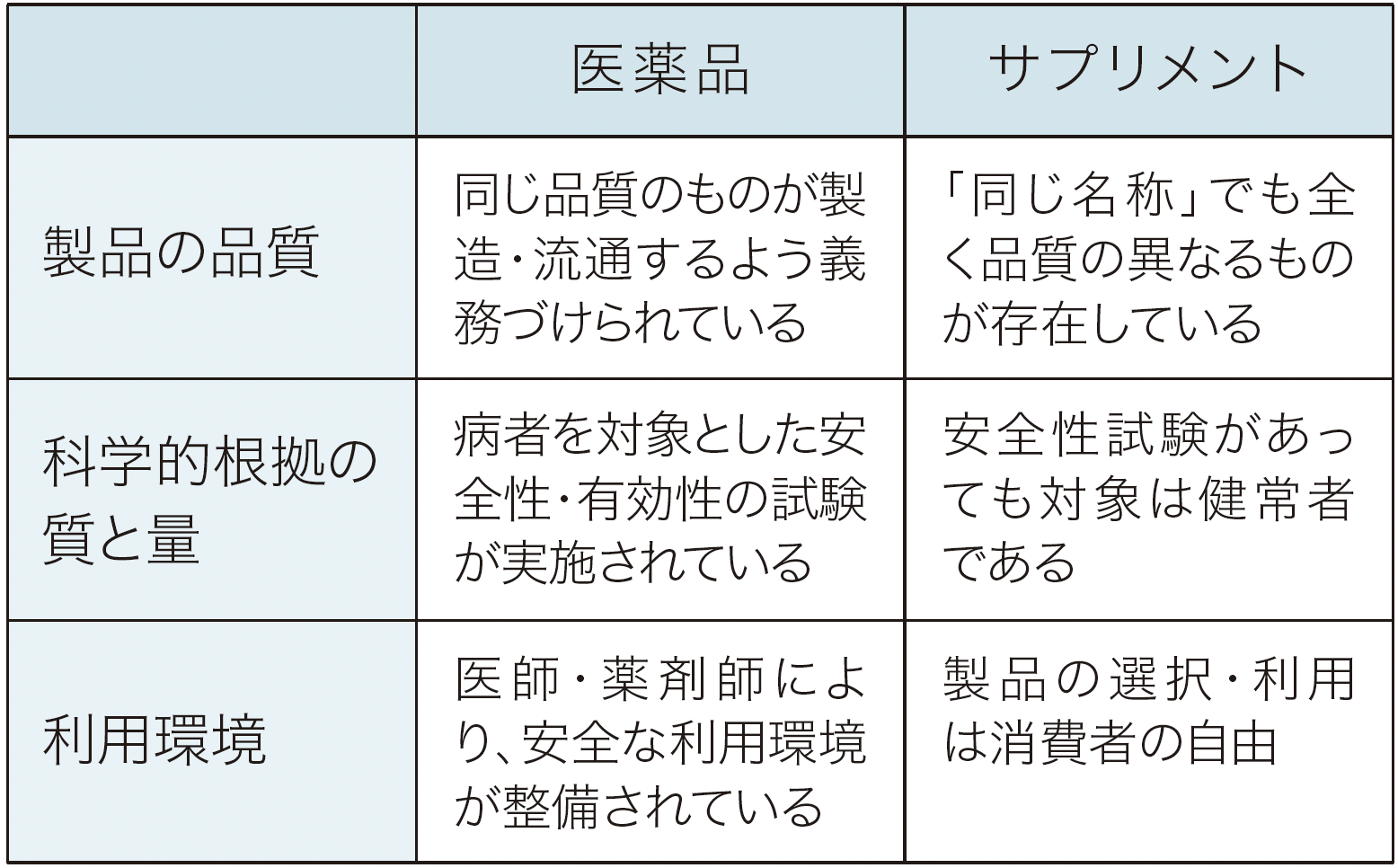 医薬品とは、下記の表でまとめた3点で大きな違いがあります。